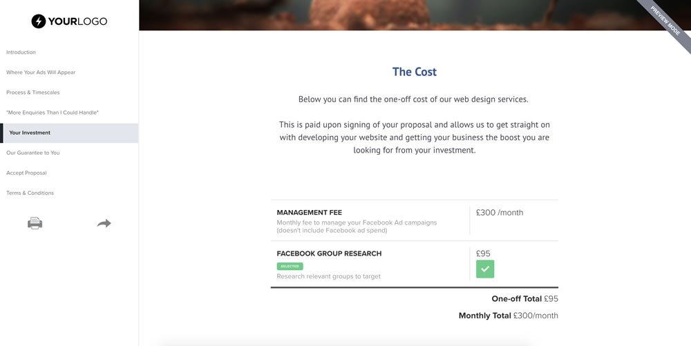 Here's an example of how this looks to your client when viewing a proposal with options they can select: