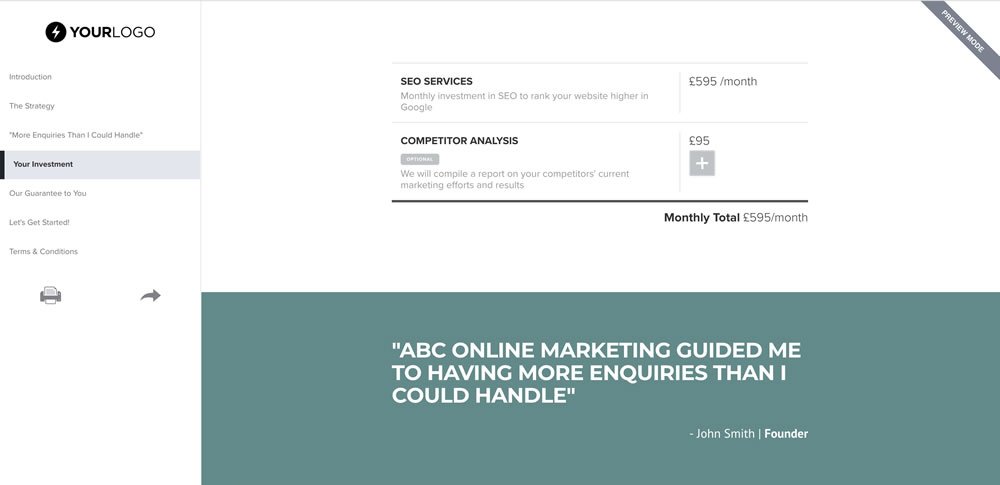 When presenting your price on your Investment page in your proposal, it's a really good idea to use this opportunity to get a testimonial in there. It can work wonders in "softening" the mental moment of seeing a high price.
